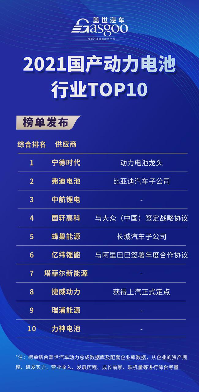結(jié)合蓋世汽車動力總成數(shù)據(jù)庫及配套企業(yè)庫數(shù)據(jù),從企業(yè)的資產(chǎn)規(guī)模、研發(fā)實力、營業(yè)收入、發(fā)展歷程、成長前景、裝機量等進行綜合考量,推出2021國產(chǎn)動力電池行業(yè)TOP10,供行業(yè)參考。